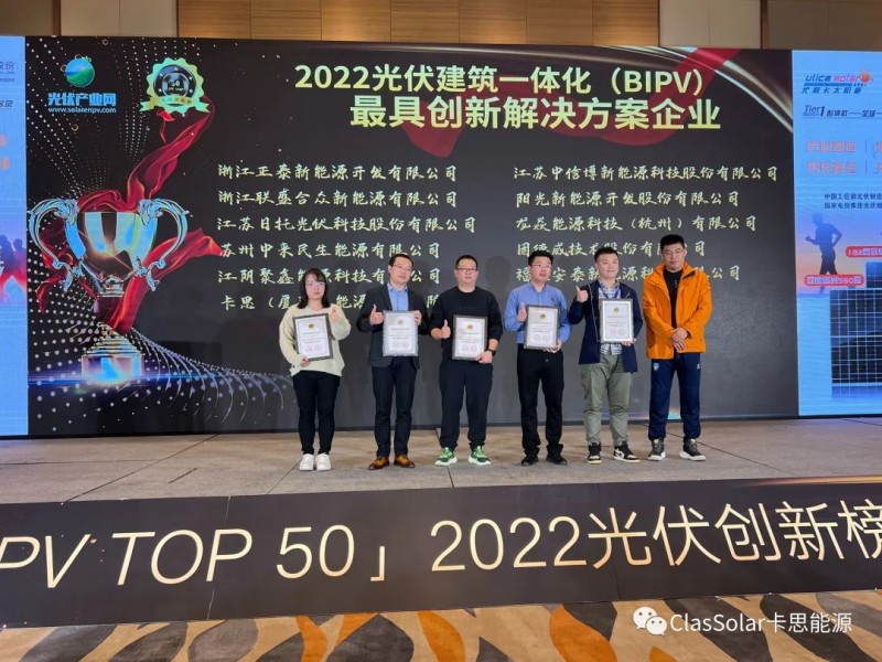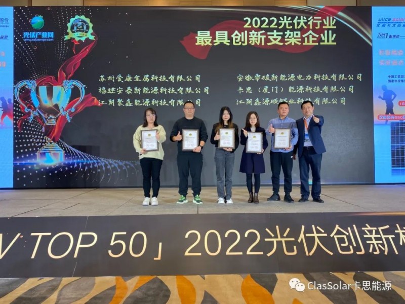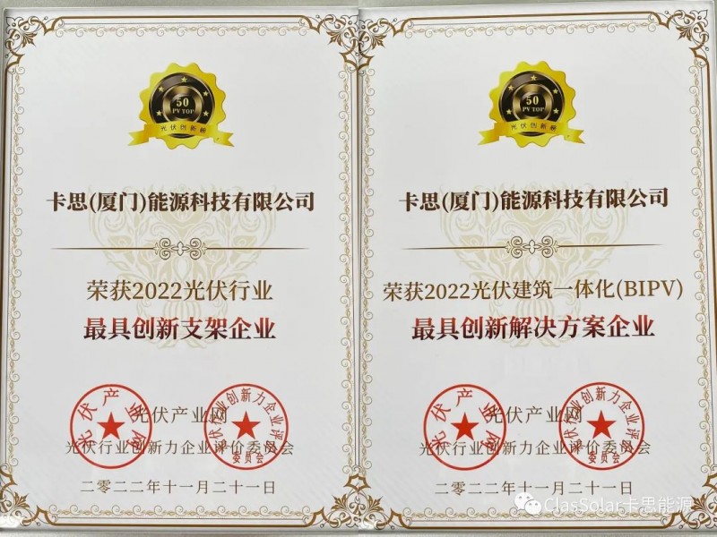 大會(huì)同期舉辦了「PV TOP 50」2022光伏創(chuàng)新榜頒獎(jiǎng)典禮,旨在表彰過去一年中引領(lǐng)行業(yè)技術(shù)升級(jí)、最具表率作用的創(chuàng)新型標(biāo)桿企業(yè)。 經(jīng)過專家的嚴(yán)格評(píng)審,卡思憑借在分布式領(lǐng)域的領(lǐng)先優(yōu)勢(shì),再獲業(yè)界認(rèn)可,在本次大會(huì)上榮膺“2022光伏行業(yè)最具創(chuàng)新支架企業(yè)”和“2022光伏建筑一體化(BIPV)最具創(chuàng)新解決方案企業(yè)”兩項(xiàng)殊榮。此次獲獎(jiǎng)既是對(duì)我司過去一年市場(chǎng)表現(xiàn)的肯定,更是對(duì)我司未來更高的期許!