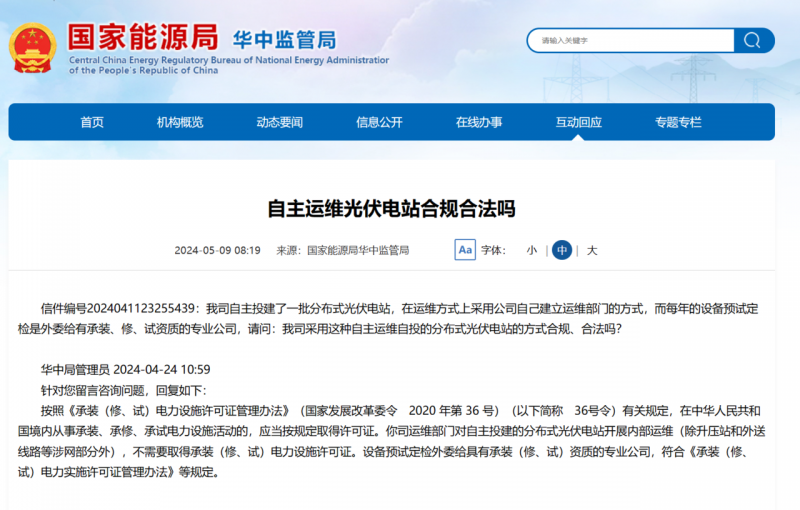 對(duì)此,國家能源局華中監(jiān)管局回復(fù):按照《承裝(修、試)電力設(shè)施許可證管理辦法》(國家發(fā)展改革委令 2020年第36號(hào))(以下簡稱 36號(hào)令)有關(guān)規(guī)定,在中華人民共和國境內(nèi)從事承裝、承修、承試電力設(shè)施活動(dòng)的,應(yīng)當(dāng)按規(guī)定取得許可證。你司運(yùn)維部門對(duì)自主投建的分布式光伏電站開展內(nèi)部運(yùn)維(除升壓站和外送線路等涉網(wǎng)部分外),不需要取得承裝(修、試)電力設(shè)施許可證。設(shè)備預(yù)試定檢外委給具有承裝(修、試)資質(zhì)的專業(yè)公司,符合《承裝(修、試)電力實(shí)施許可證管理辦法》等規(guī)定。