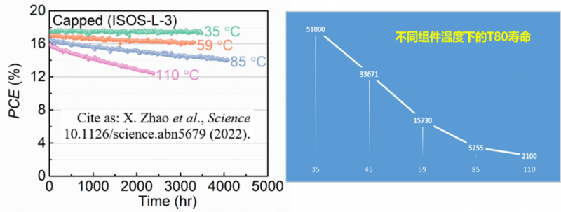 鈣鈦礦組件壽命到底能不能達到25年或者更長?實際上,學界已有很多的實驗數(shù)據(jù)的為這一問題做出了解答。比如,2022年,Science上發(fā)表了一篇關于鈣鈦礦電池穩(wěn)定性的文章(Z.Zhaoetal,Science,10.1126/science.abn5679(2022)。作者通過界面鈍化等手段提升鈣鈦礦太陽電池的穩(wěn)定性,并對鈣鈦礦太陽電池在35-110°C、65%相對濕度、1200W/m2的輻照下(1.2sun/35-110°C/65%RH)進行加速老化。結果顯示,當溫度為35°C時,老化3531小時后無任何衰退;隨著老化溫度的升高,可以觀察到電池效率的衰減,溫度越高衰減越快。當溫度為110°C時老化2100小時,效率衰退20%(如下圖所示)。下圖同時展示了不同老化溫度下,功率保持80%的時間(T80壽命)。