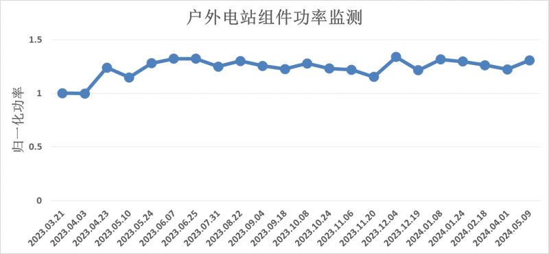 戶外實證是對光伏產品進行穩(wěn)定性與可靠性檢驗的最直接手段。極電光能去年3月搭建了鈣鈦礦戶外實證電站,目前已運行了13個月。運行期間對組件功率進行定期測試,結果顯示,組件功率沒有衰減,反而略有提升。