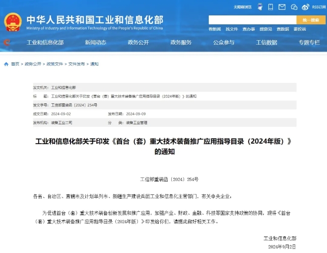 工業(yè)和信息化部關(guān)于印發(fā)《首臺(tái)(套)重大技術(shù)裝備推廣應(yīng)用指導(dǎo)目錄(2024年版)》的通知