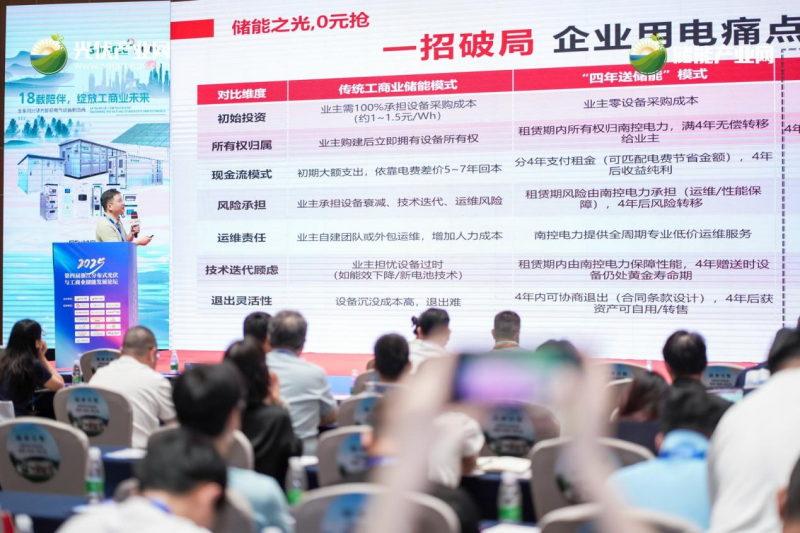 廣東南控電力有限公司高級業(yè)務(wù)總監(jiān)譚桂闐在演講中介紹其創(chuàng)新的“光儲分區(qū)送電”模式,旨在“打開企業(yè)用電的途徑通道”。該模式包含兩種零投入方案:光伏送電(企業(yè)享最低0.69元/度固定電價,3-5年后資產(chǎn)無償移交)和儲能送電(月付6500元租金,4年后資產(chǎn)移交)。運(yùn)維由南控負(fù)責(zé),企業(yè)期滿后獲得資產(chǎn)及長期穩(wěn)定收益。譚桂闐強(qiáng)調(diào),此模式顯著優(yōu)于傳統(tǒng)模式,能為企業(yè)帶來翻倍甚至三倍的收益,并通過嚴(yán)控設(shè)備質(zhì)量和靈活合作方式保障項(xiàng)目落地。