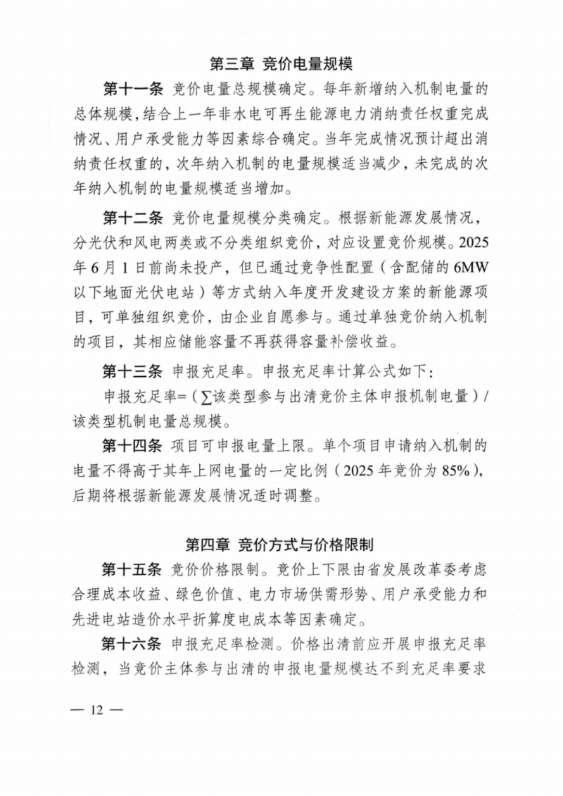 另外,文件要求根據(jù)新能源發(fā)展情況,分光伏和風(fēng)電兩類組織競價,對應(yīng)設(shè)置競價規(guī)模。2025年6月1日前尚未投產(chǎn),但已通過競爭性配置(含配儲的6MW以下地面光伏電站)等方式納入年度開發(fā)建設(shè)方案的新能源項目,可單獨組織競價,由企業(yè)自愿參與。通過單獨競價納入機制的項目,其相應(yīng)儲能容量不再獲得容量補償收益。