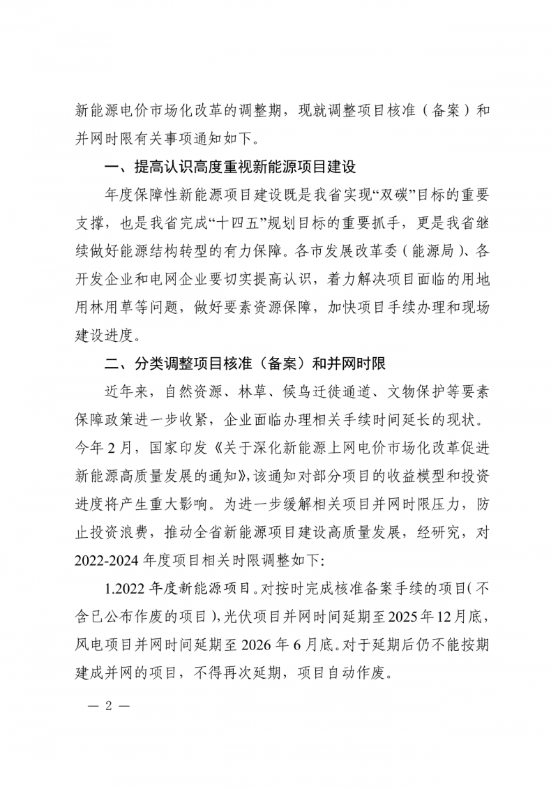 1.2022年度新能源項(xiàng)目。對(duì)按時(shí)完成核準(zhǔn)備案手續(xù)的項(xiàng)目(不含已公布作廢的項(xiàng)目),光伏項(xiàng)目并網(wǎng)時(shí)間延期至2025年12月底:風(fēng)電項(xiàng)目并網(wǎng)時(shí)間延期至2026年6月底。對(duì)于延期后仍不能按期建成并網(wǎng)的項(xiàng)目,不得再次延期,項(xiàng)目自動(dòng)作廢。