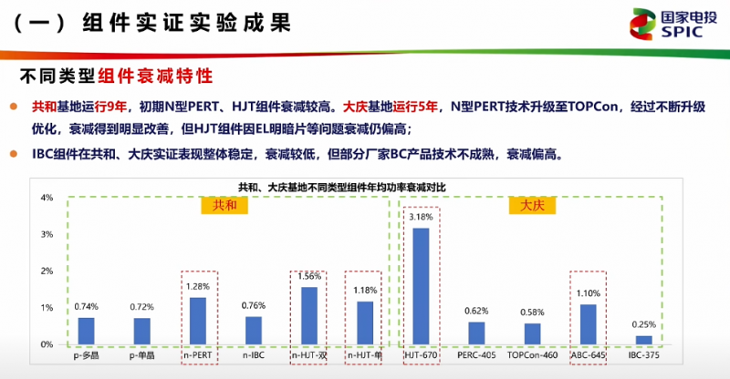 長期可靠性是評判組件技術(shù)的關(guān)鍵指標(biāo)。從共和(運行9年)和大慶(運行5年)基地的衰減數(shù)據(jù)來看: