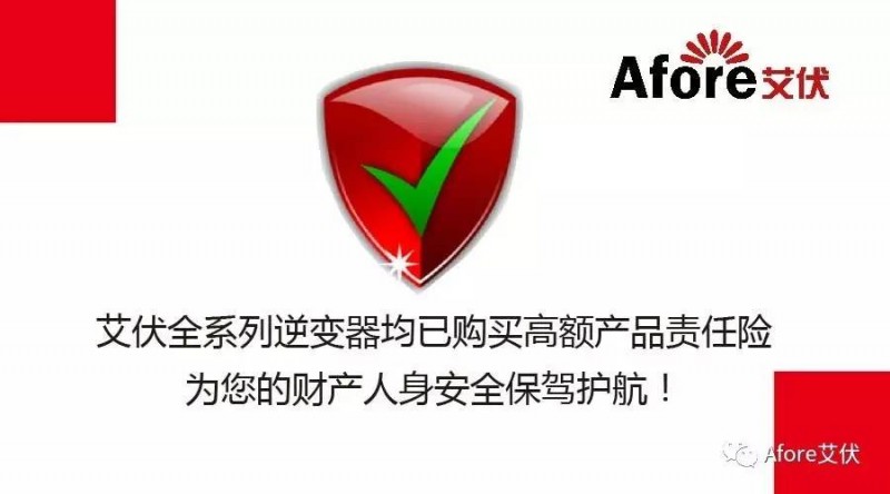 艾伏一直以過硬的產(chǎn)品質(zhì)量和優(yōu)質(zhì)的售前售后服務(wù)為理念,服務(wù)廣大客戶。此次購買高額保險(xiǎn),更是對廣大客戶的人身財(cái)產(chǎn)安全保駕護(hù)航。您所購買的每一臺艾伏逆變器背后都有一份堅(jiān)實(shí)的保障。