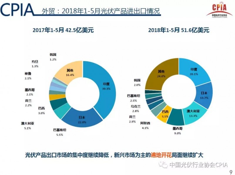 進出口方面:多晶硅進口6.7萬噸,同比下降4.3%。1-5月電池片和組件總額55.13億美元,同比增加21.2%;電池片出口3.53億美元,組件51.6億美元,組件出口16GW。