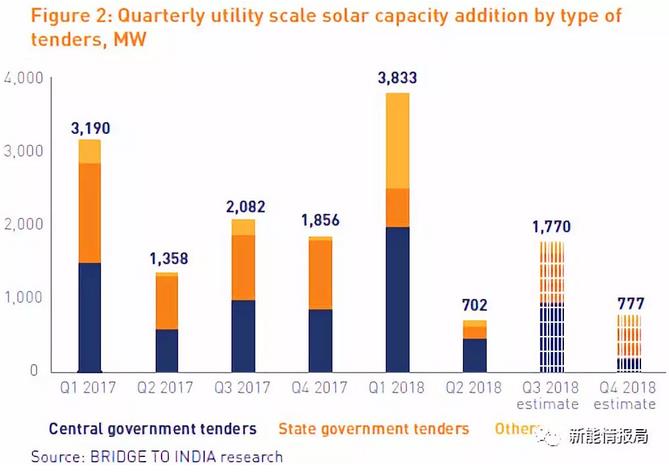 光伏電池和組件的保障關(guān)稅可能會導(dǎo)致大量開發(fā)商在下一年放緩項目的建造速度。Bridge to india預(yù)計2018年第三季度的裝機(jī)規(guī)模約為1.77GW,第四季度為777MW。