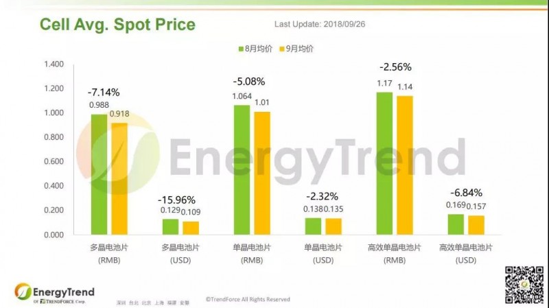 硅片環(huán)節(jié),多晶硅片的人民幣月均價(jià)為從8月的 RMB2.43/Pc 減少至9月的 RMB2.27/Pc,下跌幅度為 6.17%; 美金月均價(jià)為從8月的 US$0.336/Pc 減少至9月的 US$0.301/Pc,下滑幅度超過 10%。單晶硅片9月的人民幣月均價(jià)為 RMB3.15/Pc,比8月的 RMB3.192/Pc 稍有下滑;其美金月均價(jià)保持不變,8月、9月均為 US$0.405/Pc。