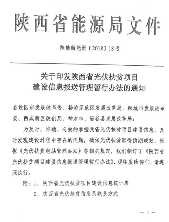 近日,陜西省能源局發(fā)布《關(guān)于印發(fā)陜西省光伏扶貧項目建設(shè)信息報送管理暫行辦法的通知》。