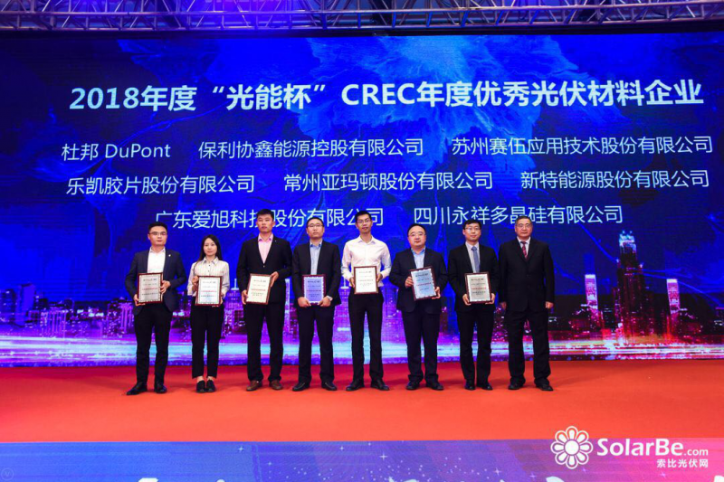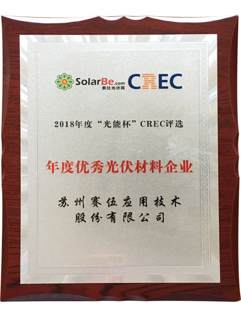 2018年度“光能杯“評選活動主旨以十年來國內(nèi)光伏行業(yè)發(fā)展技術(shù)、市場、產(chǎn)品、工藝等為背景細(xì)數(shù)光伏行業(yè)最佳技術(shù)成就、最佳企業(yè)展示、最佳團隊、行業(yè)十佳企業(yè)領(lǐng)袖等。本次活動也吸引了中國光伏領(lǐng)域上百家重量級企業(yè)的積極參與。作為全球領(lǐng)先綜合高分子材料方案解決商,蘇州賽伍應(yīng)邀出席本屆盛會并豪攬“2018年度光能杯CREC年度領(lǐng)航者企業(yè)大獎”和 ”2018年度光能杯CREC年度優(yōu)秀光伏材料企業(yè)”雙料大獎。