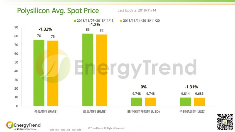11月14日的報(bào)價(jià)顯示,除了特高效單晶電池片上漲了 3.39%,從 RMB1.18/W 增加到 RMB1.22/W 之外,其他產(chǎn)品報(bào)價(jià)都保持不變。其中,常規(guī)多晶電池片的人民幣均價(jià)和美金均價(jià)分別為 RMB0.83/W 和 US$0.1/W。常規(guī)單晶電池片的人民幣均價(jià)和美金均價(jià)為 RMB1.02/W 和 US$0.125/W。高效單晶電池片兩個(gè)幣種報(bào)價(jià)也保持不變,分別為 RMB1.15/W 和 US$0.157/W。特高效單晶電池片的美金均價(jià)維穩(wěn)在 US$0.165/W。