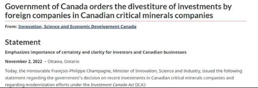 《加拿大投資法》要求外國投資接受審查,以考慮國家安全問題,弗朗索瓦表示,關(guān)鍵的礦產(chǎn)投資得加強(qiáng)審查。他說,國家安全和情報(bào)機(jī)構(gòu)的“多步驟國家安全審查程序”得出結(jié)論,3家中國公司必須剝離其在加拿大關(guān)鍵礦產(chǎn)公司的股份。