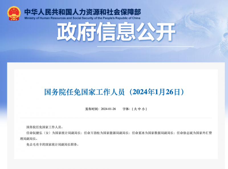 2024年1月26日,國(guó)務(wù)院任命萬(wàn)勁松為國(guó)家能源局副局長(zhǎng);任命夏冰為國(guó)家數(shù)據(jù)局副局長(zhǎng);任命徐志斌為國(guó)家外匯管理局副局長(zhǎng)。免去毛有豐的國(guó)家統(tǒng)計(jì)局副局長(zhǎng)職務(wù)。