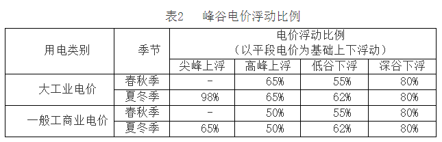 (三)調(diào)整峰谷電價(jià)浮動(dòng)比例,具體見(jiàn)表2。浮動(dòng)比例以平段電價(jià)為基礎(chǔ),平段電價(jià)包含上網(wǎng)電價(jià)、上網(wǎng)環(huán)節(jié)線損費(fèi)用、系統(tǒng)運(yùn)行費(fèi)用、輸配電價(jià)(不含容(需)電價(jià))、政府性基金及附加。