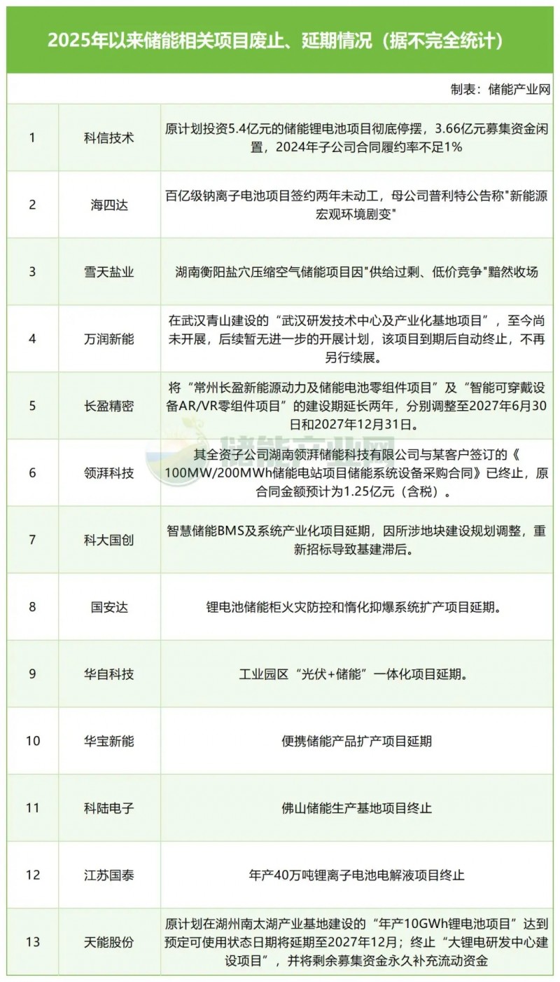 除卻儲能招中標市場,實際上自2025年開始,包括寧夏、內(nèi)蒙古、山西、新疆等多地儲能項目宣布廢止,此外,企業(yè)層面包括領(lǐng)湃科技、萬潤新能、海四達、長盈精密、科信技術(shù)等企業(yè)也相繼宣布儲能類項目終止、延期,涉及的技術(shù)及產(chǎn)品類型包括鋰電池、鈉電池、固態(tài)電池、儲能逆變器、系統(tǒng)集成等。