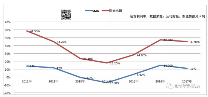 圖1:2011-2017年陽光電源、SMA運(yùn)營利潤率統(tǒng)計曲線