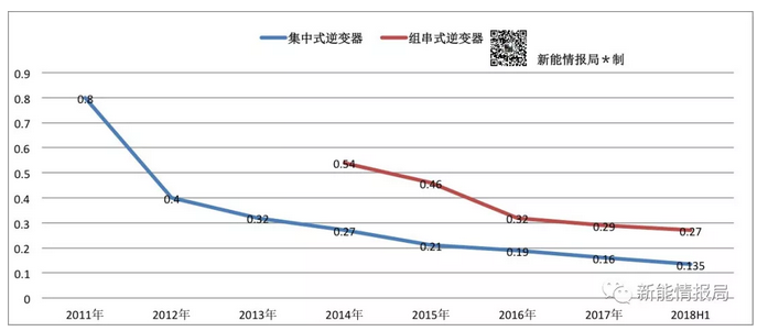 組串式逆變器亦不可避免地進(jìn)入了一輪又一輪的價格戰(zhàn)。組串式逆變器從2014年的0.54元/W,下降到2018年上半年的0.27元/W,下降幅度更加明顯,預(yù)計2018年底價格還將下降。