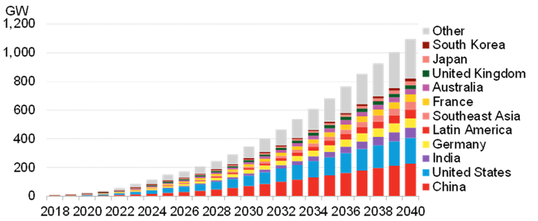 2018到2040年全球累計儲能部署預(yù)測