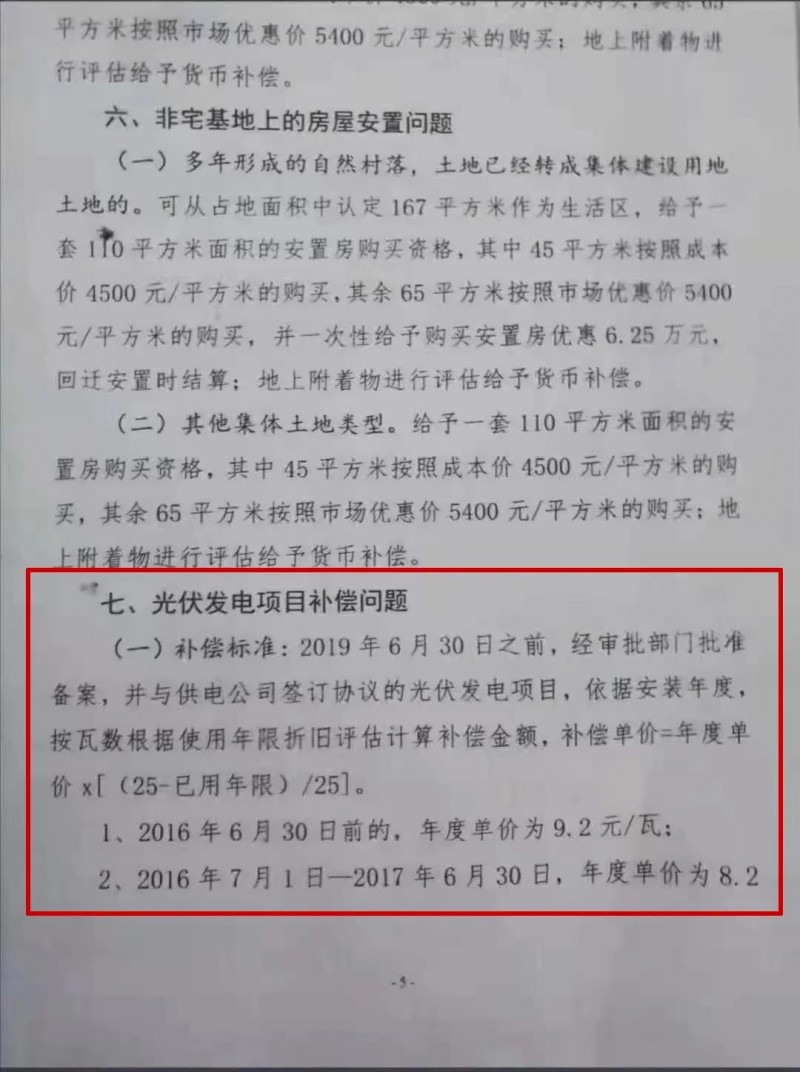 1、補償按照“當年度安裝單價×[(25—已使用年限)/25]”,當年度單價基本上和當年市場安裝價格差不多,按照25年周期和已使用年限計算折舊,基本上戶用電站都是近5年內安裝的,所以補償差不多是按照當時安裝價格的8,9折以上補償(越早裝的收益越好)。