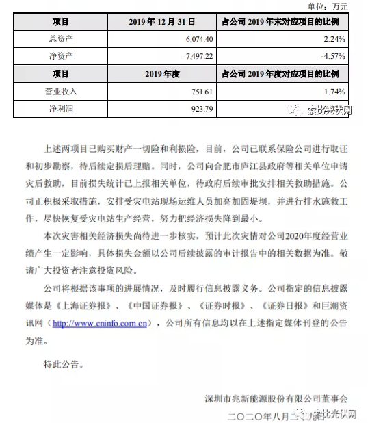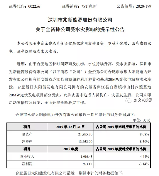 8月29日,兆新能源股份有限公司發(fā)布《關于全資孫公司受水災影響的提示性公告》,根據公告顯示,20MW光伏電站被洪水淹沒,另有20MW光伏發(fā)電項目部分受災,兩項目已購買財產一切險和利損險。