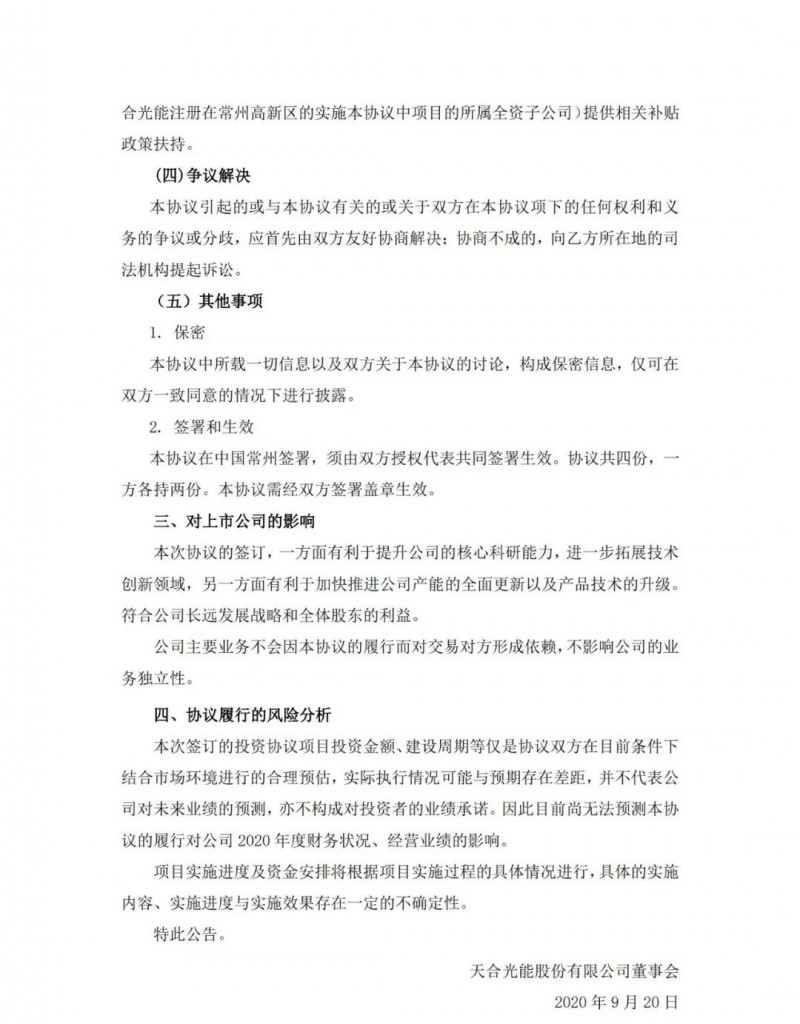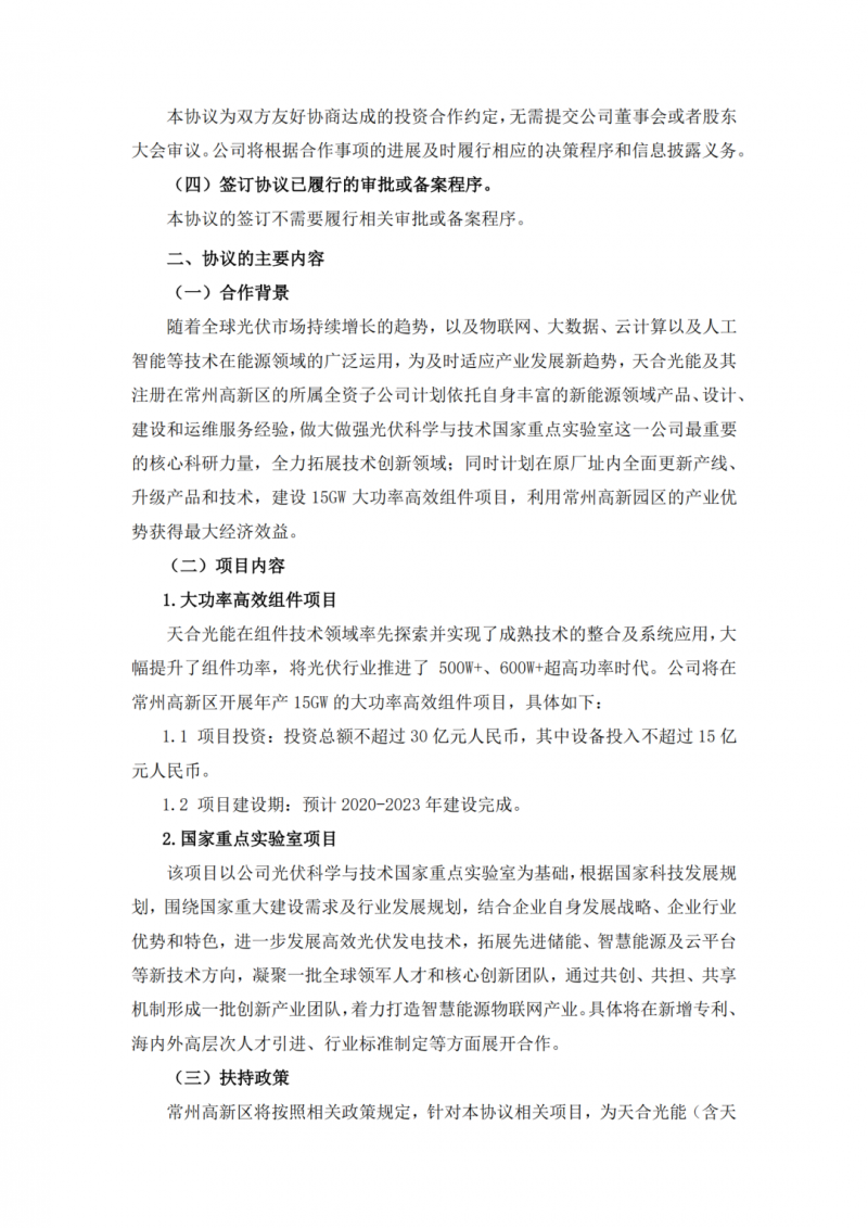 9 月20日,天合光能發(fā)布公告稱,公司在組件技術(shù)領(lǐng)域率先探索并實現(xiàn)了成熟技術(shù)的整合及系統(tǒng)應(yīng)用,大幅提升了組件功率,將光伏行業(yè)推進了500W+、600W+超高功率時代。將在常州高新區(qū)開展年產(chǎn)15GW的大功率高效組件項目,投資總額不超過30億元人民幣,其中設(shè)備投入不超過15億元人民幣。預(yù)計2020-2023年建設(shè)完成。