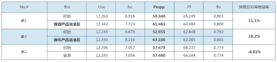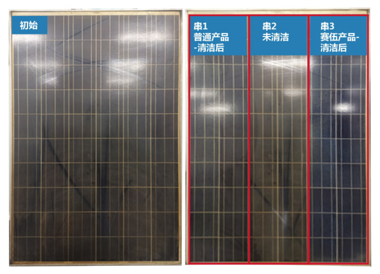 將組件根據(jù)電池排布及電學(xué)連接,分為3串,每串為相鄰的10片電池,共20片串聯(lián)連接的電池,對(duì)應(yīng)接線盒內(nèi)的一個(gè)旁路二極管。串1采用普通清潔產(chǎn)品進(jìn)行清潔;串2未做清潔處理,便于清潔前后比對(duì);串3采用賽伍的玻璃表面清潔產(chǎn)品CyClean-1。串1區(qū)域,采用普通清潔產(chǎn)品后,組件玻璃表面仍存在發(fā)黃現(xiàn)象。串3區(qū)域,采用賽伍清潔產(chǎn)品CyClean-1清潔后,玻璃表面不存在發(fā)黃的現(xiàn)象,表面生銹的物質(zhì)基本已經(jīng)清洗干凈。表1是串1和串3在清潔后的功率變化。可以看出,無論是賽伍清潔產(chǎn)品Cyclean-1還是普通清潔產(chǎn)品在清潔后, 組件功率都有一定程度的恢復(fù)。數(shù)據(jù)顯示,使用普通清潔產(chǎn)品后,功率恢復(fù)11.1%;采用賽伍產(chǎn)品清潔后,功率恢復(fù)19.2%,同比普通清潔產(chǎn)品增長73%。