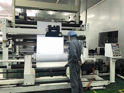 經(jīng)過除塵、穿防護(hù)服等嚴(yán)格程序,記者進(jìn)入福膜新材料科技有限公司的生產(chǎn)車間。生產(chǎn)車間內(nèi)并沒有多少工人,自動化運行的生產(chǎn)線經(jīng)過加料、加工等各個環(huán)節(jié),乳白色的薄膜源源不斷地從生產(chǎn)線上出來。
