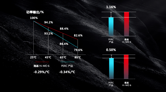 在極端天氣頻發(fā)的當(dāng)下,峰值功率溫度系數(shù)絕對數(shù)值更小的組件產(chǎn)品顯然更受歡迎。以隆基Hi-MO 6高效組件產(chǎn)品為例,它的峰值功率溫度系數(shù)就控制在了-0.29%/℃,相較目前主流的PERC組件有著明顯的高溫發(fā)電性能提升。
