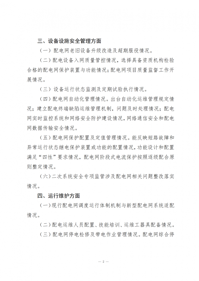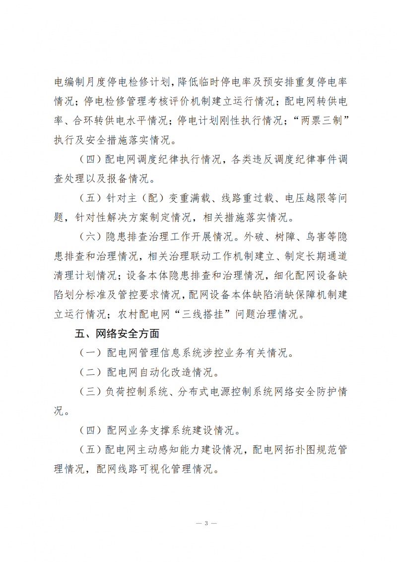 現(xiàn)行配電網(wǎng)調(diào)度運行體制機制與新型配電網(wǎng)系統(tǒng)適配情況;配電網(wǎng)人員和運維工器具配置情況;主(配)變重滿載、線路重過載、電壓越限等運行風(fēng)險摸排和解決情況;安全風(fēng)險管控和隱患排查治理等安全管理制度落實情況;配電網(wǎng)電力監(jiān)控系統(tǒng)網(wǎng)絡(luò)安全管控情況;停電檢修及帶電作業(yè)管理情況;農(nóng)村配電網(wǎng)“三線搭掛”問題治理情況。