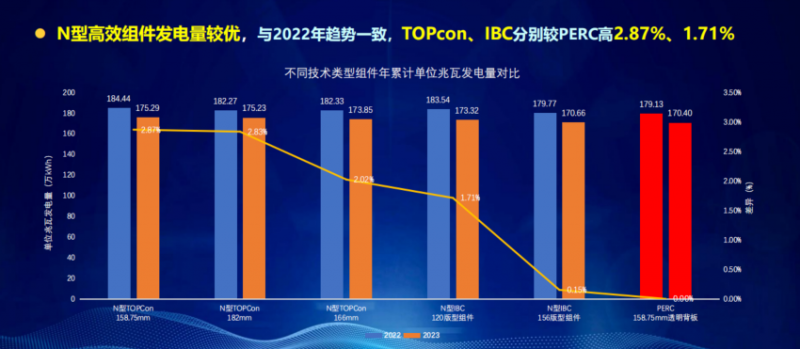 今年3月,國(guó)家光伏、儲(chǔ)能實(shí)證實(shí)驗(yàn)平臺(tái)(大慶基地)公布了2023年度實(shí)證實(shí)驗(yàn)數(shù)據(jù)成果。該成果表示,N型高效組件發(fā)電量較優(yōu),與2022年趨勢(shì)一致,TOPCon、IBC分別較PERC高2.87%、1.71%,即158.75版型的TOPCon發(fā)電量較120版型的IBC高1.16%。進(jìn)一步分析發(fā)現(xiàn),如果用比較相同(相近)硅片尺寸進(jìn)行比較,158.75mm的TOPCon相對(duì)156mm版型的IBC的發(fā)電增益大約為2.72%。