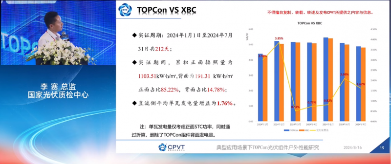 CPVT位于銀川的實(shí)證基地,代表溫帶大陸性氣候場(chǎng)景,干熱,溫差大。通過(guò)對(duì)客戶自行組織送樣的三串不同技術(shù)路線組件性能比對(duì)實(shí)證項(xiàng)目的數(shù)據(jù)分析,2024年1月至2024年7月的實(shí)證期內(nèi),在以正面STC功率為基準(zhǔn)計(jì)算得出:半片雙面TOPCon組件的正面單瓦發(fā)電量較XBC組件增益為1.76%。