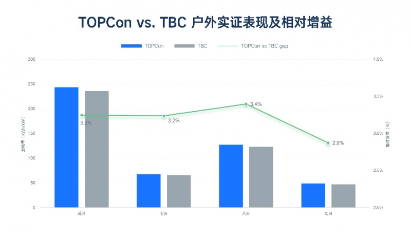 從測(cè)試周期內(nèi)的發(fā)電量數(shù)據(jù)來(lái)看,TOPCon組件相較于TBC組件的單瓦平均發(fā)電增益高3.15%,最高月相對(duì)增益達(dá)3.4%(2024年8月),充分證明了TOPCon組件的卓越發(fā)電能力。