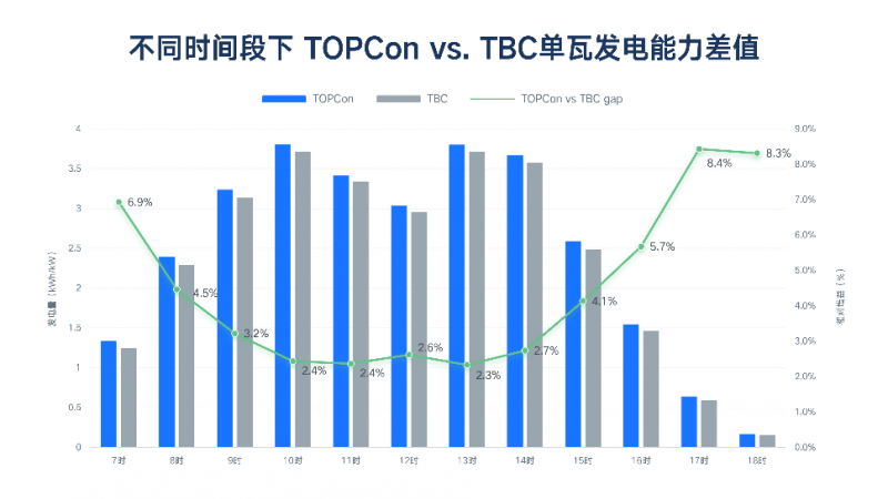 通過(guò)進(jìn)一步分析一天不同時(shí)段的發(fā)電量數(shù)據(jù),可以發(fā)現(xiàn)TOPCon組件具有顯著的低輻照優(yōu)勢(shì)。一般來(lái)說(shuō),光伏組件大部分時(shí)間都是在低于1000W/m²的輻照度下工作,因此低輻照性能越優(yōu),組件單瓦發(fā)電能力越高。通過(guò)以往的實(shí)測(cè)數(shù)據(jù),TOPCon的低輻照性能相比XBC高約5%。根據(jù)實(shí)證數(shù)據(jù),在早晚輻照相對(duì)較弱時(shí)段,TOPCon組件發(fā)電量數(shù)據(jù)遠(yuǎn)超TBC組件。在早上7-8點(diǎn)時(shí),TOPCon相比TBC單瓦發(fā)電能力高6.9%;晚上17-19點(diǎn)時(shí),相對(duì)增益更是高達(dá)8.3%-8.4%。
