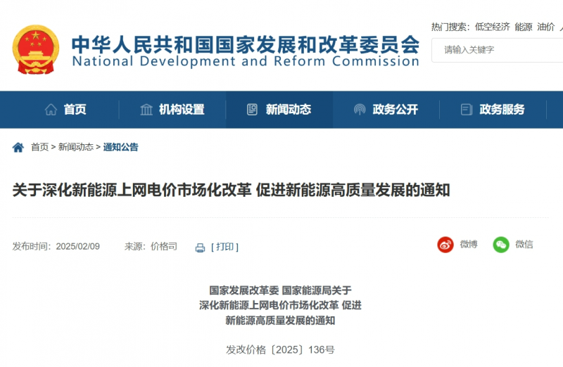 2月9日,國家發(fā)展改革委、國家能源局聯(lián)合印發(fā)《關(guān)于深化新能源上網(wǎng)電價(jià)市場(chǎng)化改革促進(jìn)新能源高質(zhì)量發(fā)展的通知》(發(fā)改價(jià)格〔2025〕136號(hào),以下簡(jiǎn)稱《通知》)。