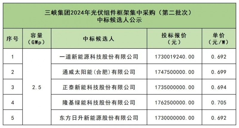 2月17日,三峽集團2024年光伏組件框架集中采購(第二批次)中標候選人公示。中標價格在0.692-0.705元/W之間,均價為0.696元/W。