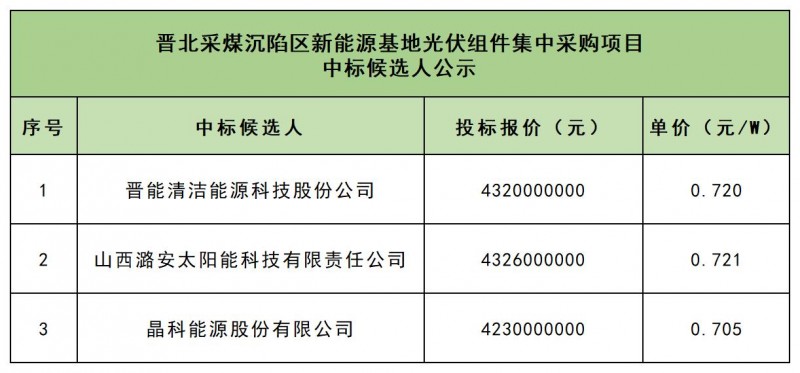 3月7日,晉能控股晉北能源(山西)有限公司晉北采煤沉陷區(qū)新能源基地光伏組件集中采購項目中標候選人公示,此項目擬采購6GW雙面雙玻182*182-210mm/210mmTOPCon組件,投標單價在0.705~0.721元/W之間。