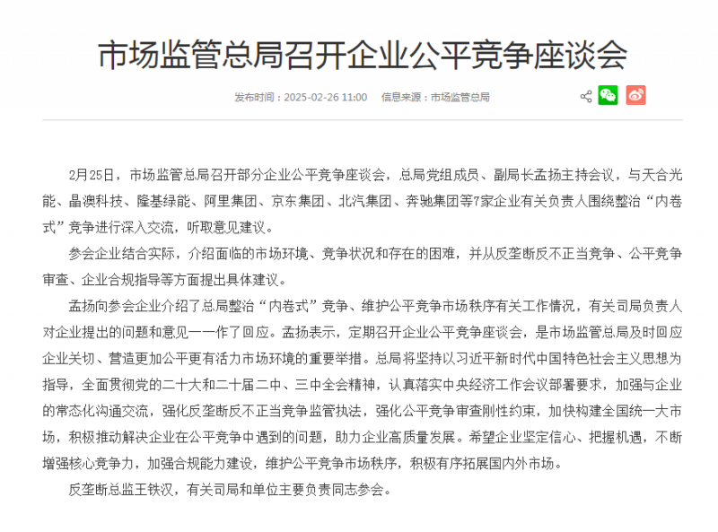 2月25日,市場監(jiān)管總局召開部分企業(yè)公平競爭座談會,天合光能、晶澳科技、隆基綠能等7家企業(yè)有關負責人圍繞整治“內卷式”競爭進行深入交流。