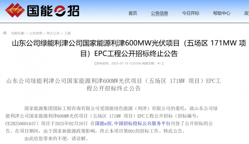 7月10日,國家能源集團招標平臺發(fā)布了關于3個光伏項目EPC工程公開招標終止的公告,總容量共計352MW。分別為利津600MW光伏項目(