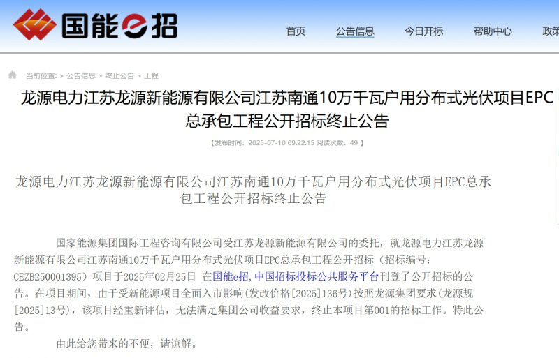 7月10日,國家能源集團招標平臺發(fā)布了關于3個光伏項目EPC工程公開招標終止的公告,總容量共計352MW。