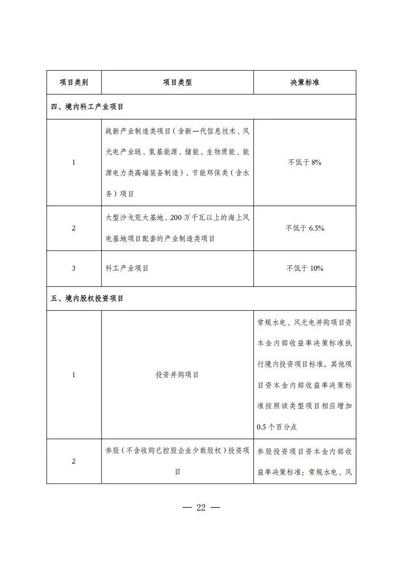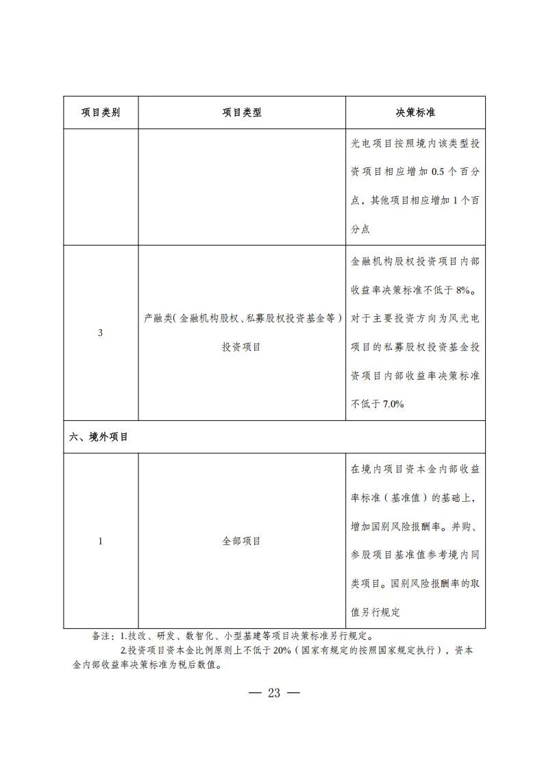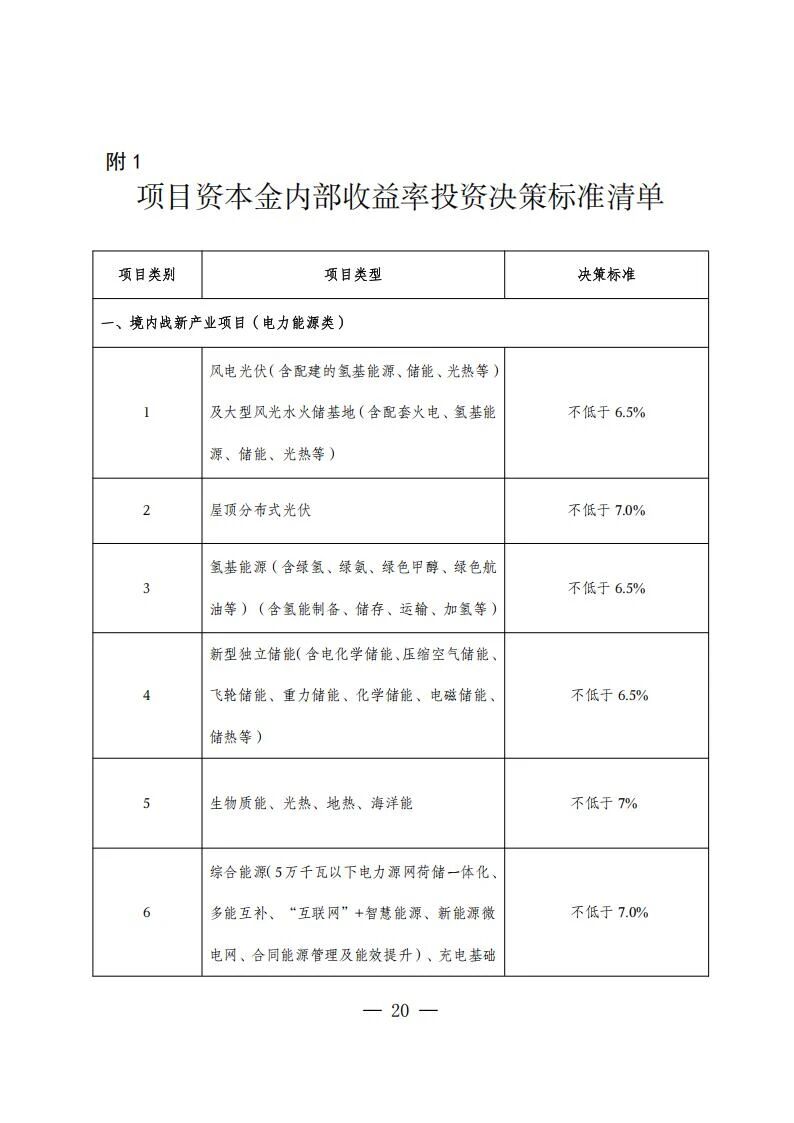 在具體的收益率要求方面,風電光伏及大型風光水火儲基地等項目,資本金內部收益率投資決策標準不低于6.5%;屋頂分布式光伏不低于7%;儲能項目不低于6.5%。