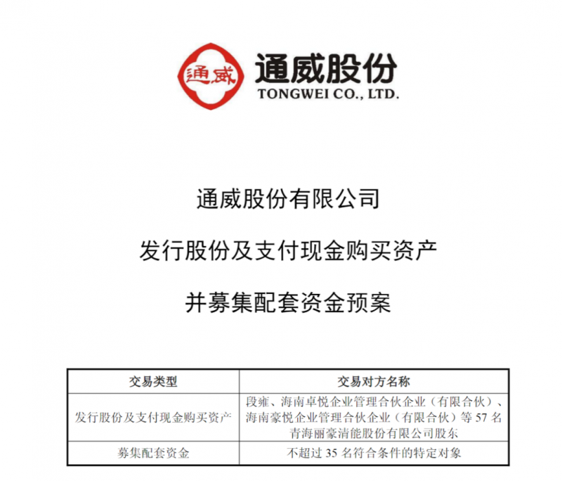 就在不久前,行業(yè)另一龍頭通威股份也正式披露發(fā)行股份及支付現(xiàn)金購(gòu)買資產(chǎn)并募集配套資金預(yù)案,擬通過發(fā)行股份及支付現(xiàn)金相結(jié)合的方式,收購(gòu)麗豪清能100%股權(quán)。