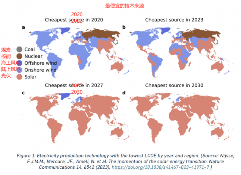 這一增長得益于太陽能成本的快速下降和部署范圍的擴(kuò)大。如圖所示,2020年到2023年,發(fā)生了重大轉(zhuǎn)變。預(yù)計(jì)2023年至2027年間,光伏將成為成本最低的電力來源。到2030年,光伏預(yù)計(jì)將成為全球大多數(shù)地區(qū)平準(zhǔn)化電力成本(LCOE)最低的發(fā)電方式。