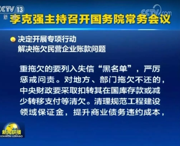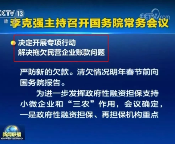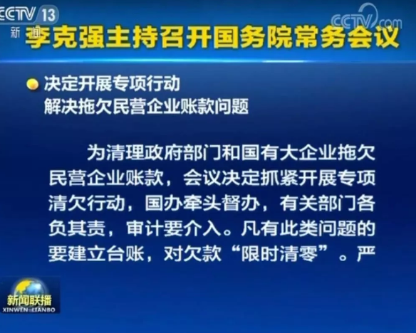 國(guó)務(wù)院總理李克強(qiáng)11月9日主持召開(kāi)國(guó)務(wù)院常務(wù)會(huì)議,決定開(kāi)展專項(xiàng)行動(dòng),解決拖欠民營(yíng)企業(yè)賬款問(wèn)題。