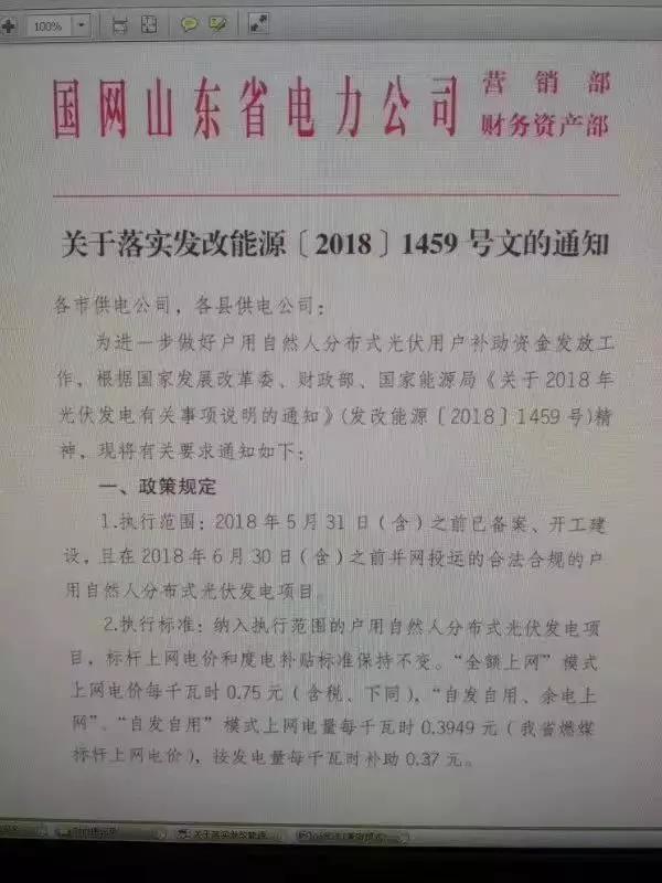 2018年12月13日,山東電網(wǎng)公司發(fā)布《關(guān)于落實發(fā)改能源〔2018〕1459號文的通知》,明確630前并網(wǎng)的戶用光伏予以補(bǔ)貼。