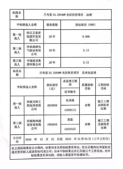 光伏扶貧項(xiàng)目-結(jié)果公告》,中標(biāo)公示顯示,對(duì)于EPC總承包,河南森源電氣股份有限公司以3.290012億元的投標(biāo)總報(bào)價(jià)名列中標(biāo)第一候選人;浙江正泰新能源開(kāi)發(fā)有限公司以0.096元/KWh的報(bào)價(jià)位列20年運(yùn)維的中標(biāo)第一候選人;河南方陣工程監(jiān)理有限公司263.5566萬(wàn)元的報(bào)價(jià)位列總承包監(jiān)理中標(biāo)第一候選人。EPC單價(jià)約為:329001200元÷35.3584MW≈9.3元/瓦