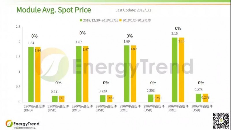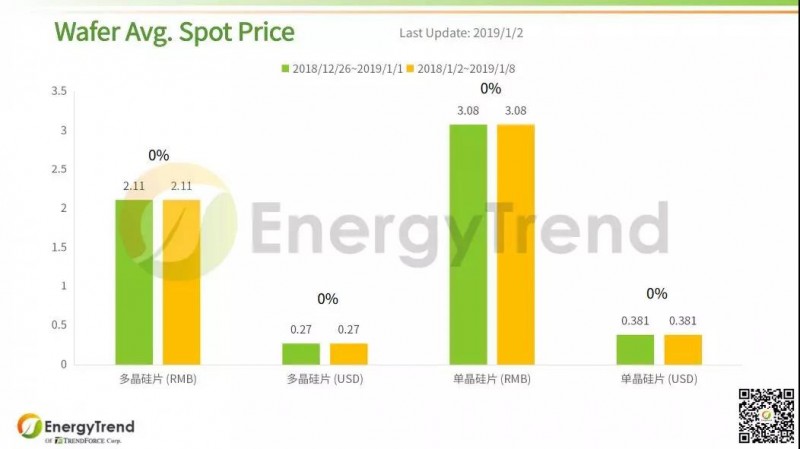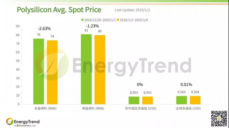 根據(jù)集邦咨詢(xún)旗下新能源研究中心集邦新能源網(wǎng)(EnergyTrend)2019年1月2日最報(bào)價(jià),大陸多晶用硅料從 RMB76/KG 下跌至到 RMB74/KG,幅度為 -2.63%;單晶硅料最新均價(jià)為 RMB80/KG,比上周減少了 1.23%。非中國(guó)區(qū)多晶硅料均價(jià)維持在 US$8.953/KG 不變;而全球多晶硅料則從 US$9.563/KG 增長(zhǎng)至 US$9.564/KG,基本與上周持平。