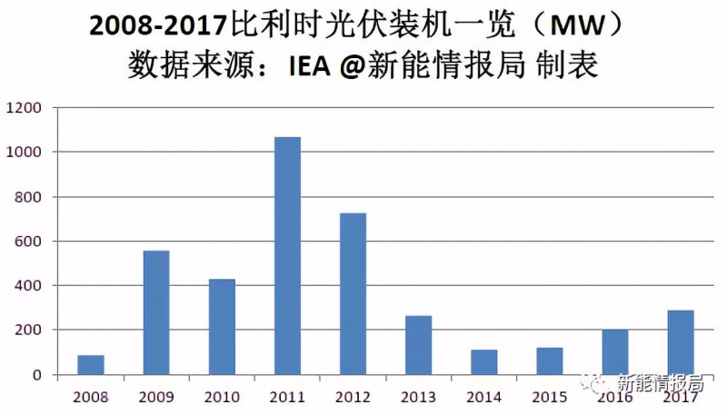 從下圖可以看出,比利時(shí)裝機(jī)在2011年達(dá)到頂峰,當(dāng)年裝機(jī)約為1.068GW,此后一路下滑,直到2016年才開始又有了較為明顯的上升。