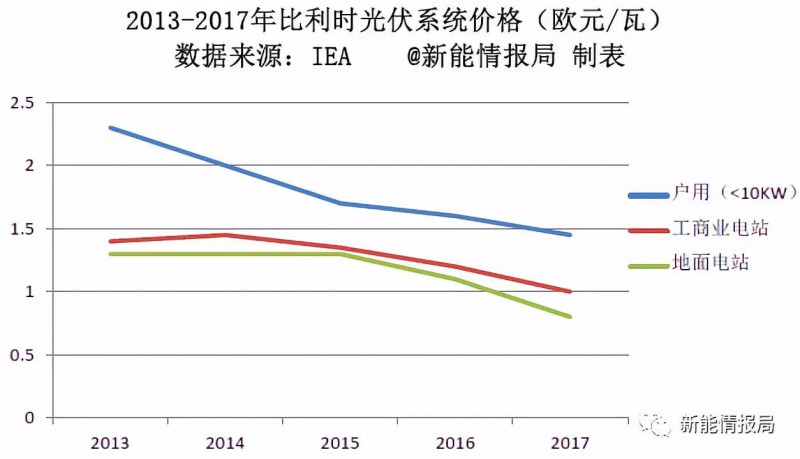 比利時(shí)的光伏裝機(jī)中戶用和工商業(yè)屋頂占據(jù)了絕大部分比例,其中光伏系統(tǒng)的價(jià)格變化趨勢如下:
