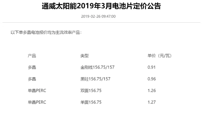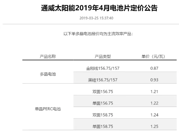 昨日,通威股份發(fā)布2019年4月電池片定價(jià)公告,多晶PERC電池片價(jià)格從0.91-0.96元/瓦下降至0.87-0.93元/瓦。單晶PERC電池片價(jià)格從1.26-1.27元每瓦降至1.21-1.22元/瓦。